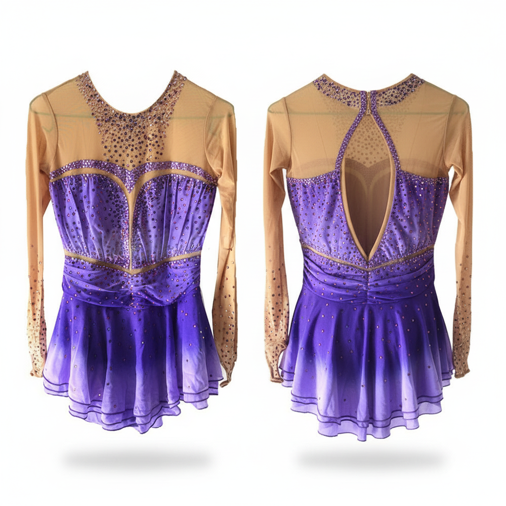 This figure skating dress features delicate mesh long sleeves and a stunning ombre purple hue, adorned with rhinestone embellishments that catch the light beautifully. Perfect for competitions and performances, it offers a flattering fit with a comfortable stretch that allows for a full range of motion while maintaining its elegant silhouette.