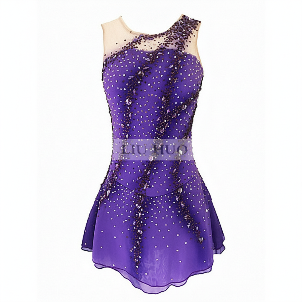This elegant sleeveless figure skating dress features a blend of spandex and mesh in a regal purple shade, designed to provide comfort and unrestricted movement. Its rhinestone embellishments add a touch of sparkle, making it perfect for dazzling performances on the ice.