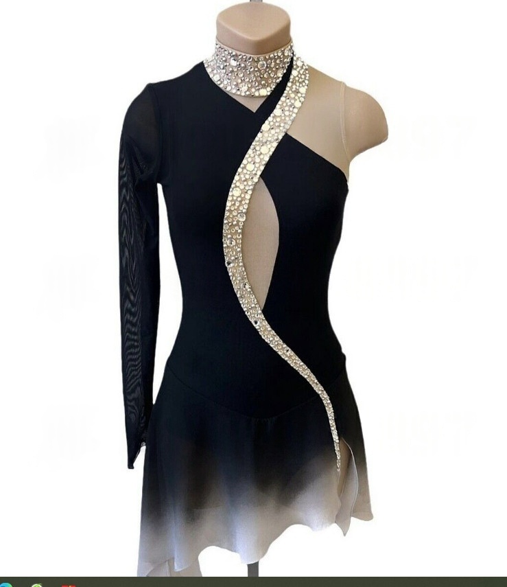 This sophisticated figure skating dress features a fitted silhouette with a striking black and white ombre skirt, designed for elegant movement and a captivating presence on the ice.