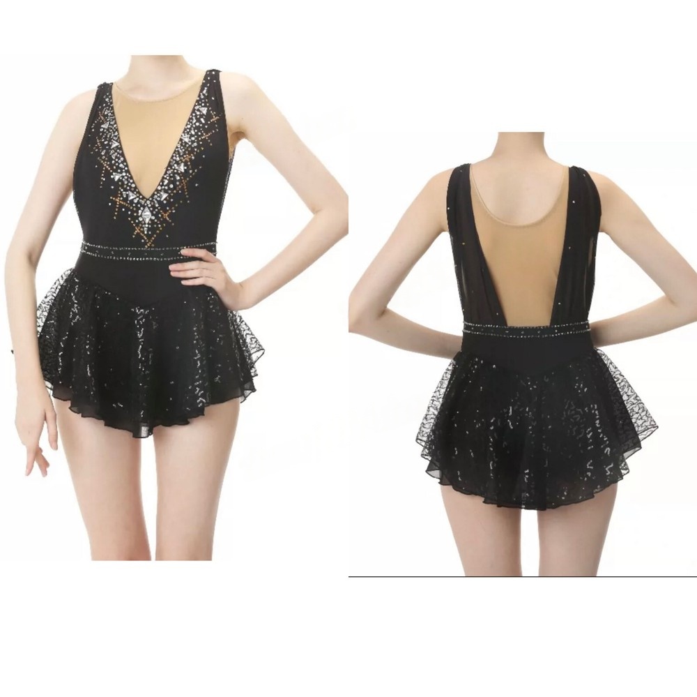 The dress boasts a dominant black color, providing a classic and versatile base, while the sparkling embellishments add a touch of competitive glamour and catch the light beautifully during spins and jumps.