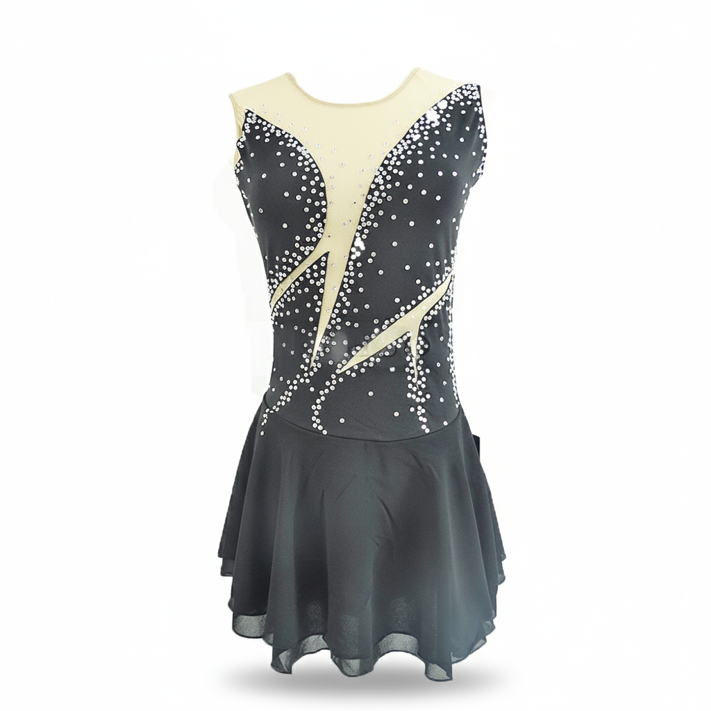 This elegant girls' figure skating dress features a black spandex mesh fabric, embellished with rhinestones for a sparkling finish. Designed to be sleeveless, it provides flexibility and comfort, making it ideal for performances on the ice.