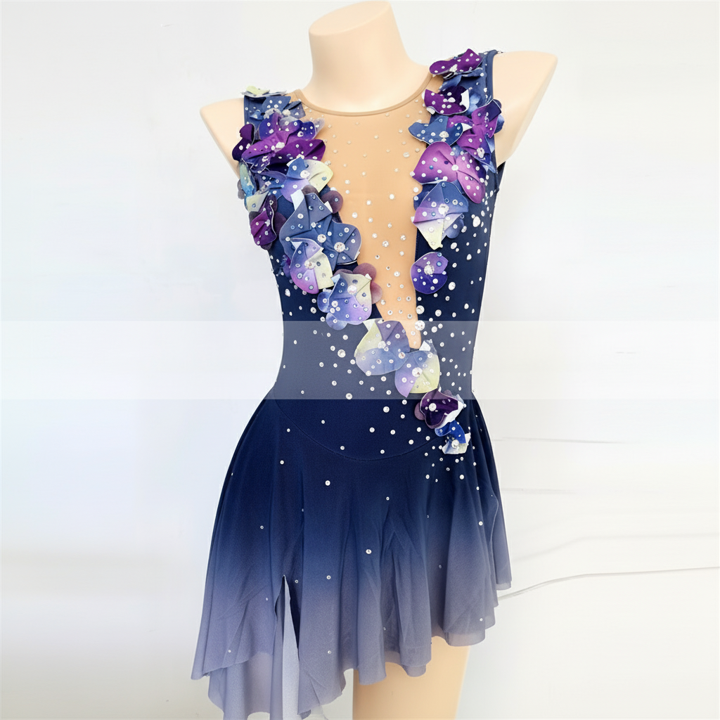 This ombre blue-purple figure skating dress features a flattering mesh neckline and sparkling rhinestone flower appliques, offering elegance and comfort for skating performances or practice. Crafted with stretchable fabric, it ensures easy movement and can be simply cared for with gentle washing.