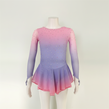 This girls' figure skating dress boasts an ombre pink to purple design, long sleeves, and elegant rhinestone accents for a sparkling performance. Ideal for young skaters seeking flexibility and style on ice, it combines comfort with eye-catching details, making it perfect for competitions and practice sessions.