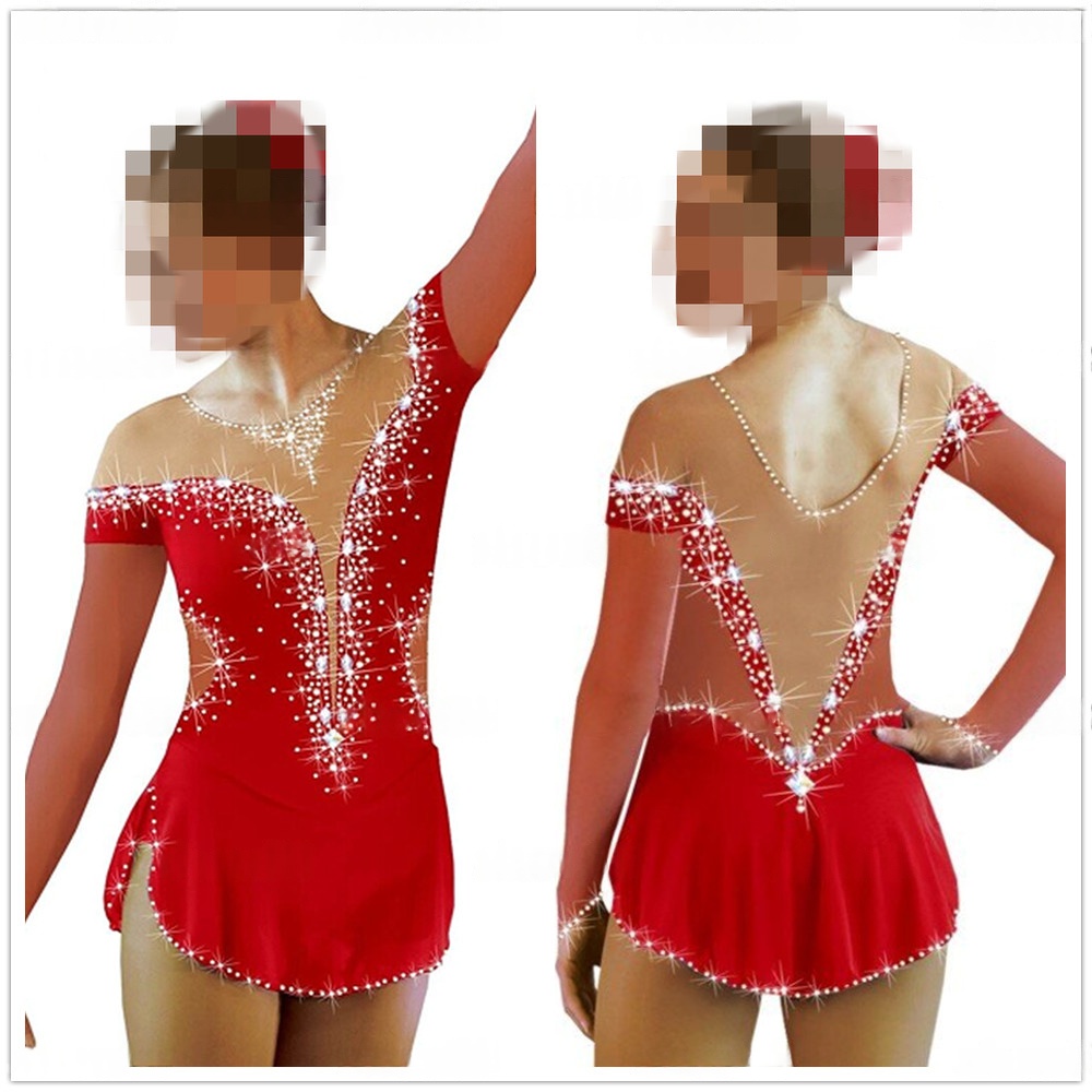 Adorned with intricate patterns of shimmering rhinestones across the bodice and back, the vibrant red fabric creates a dazzling effect that captures light beautifully during routines.