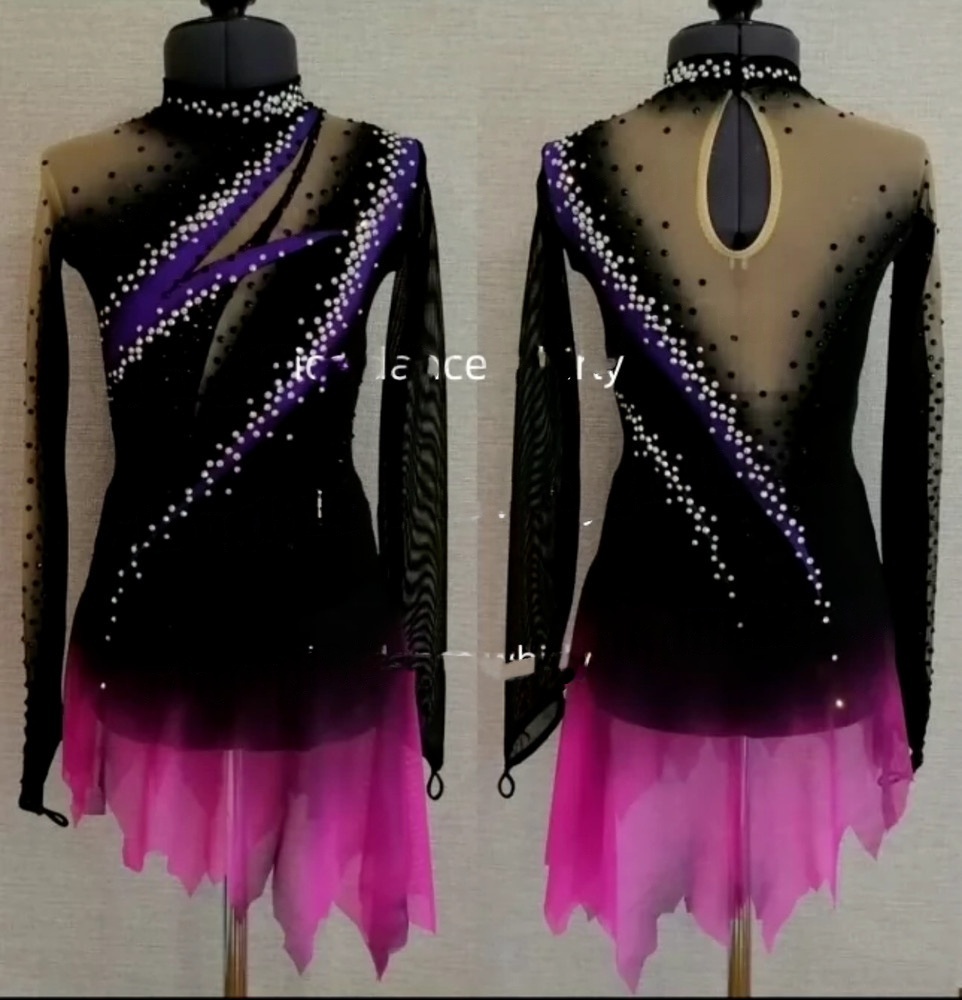 The design transitions from a solid black bodice to an ombre pink flared skirt, creating a visually captivating effect that enhances every spin and leap. This color gradation provides a vibrant contrast against the dark base.
