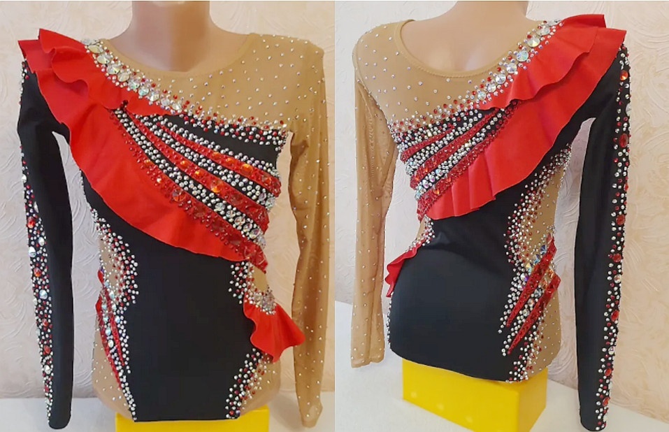 Featuring long sleeves and a crystal-embellished round neckline, the design is further accentuated by a striking color block pattern of black and red, adorned with intricate rhinestone and sequin detailing that creates a dynamic visual appeal.
