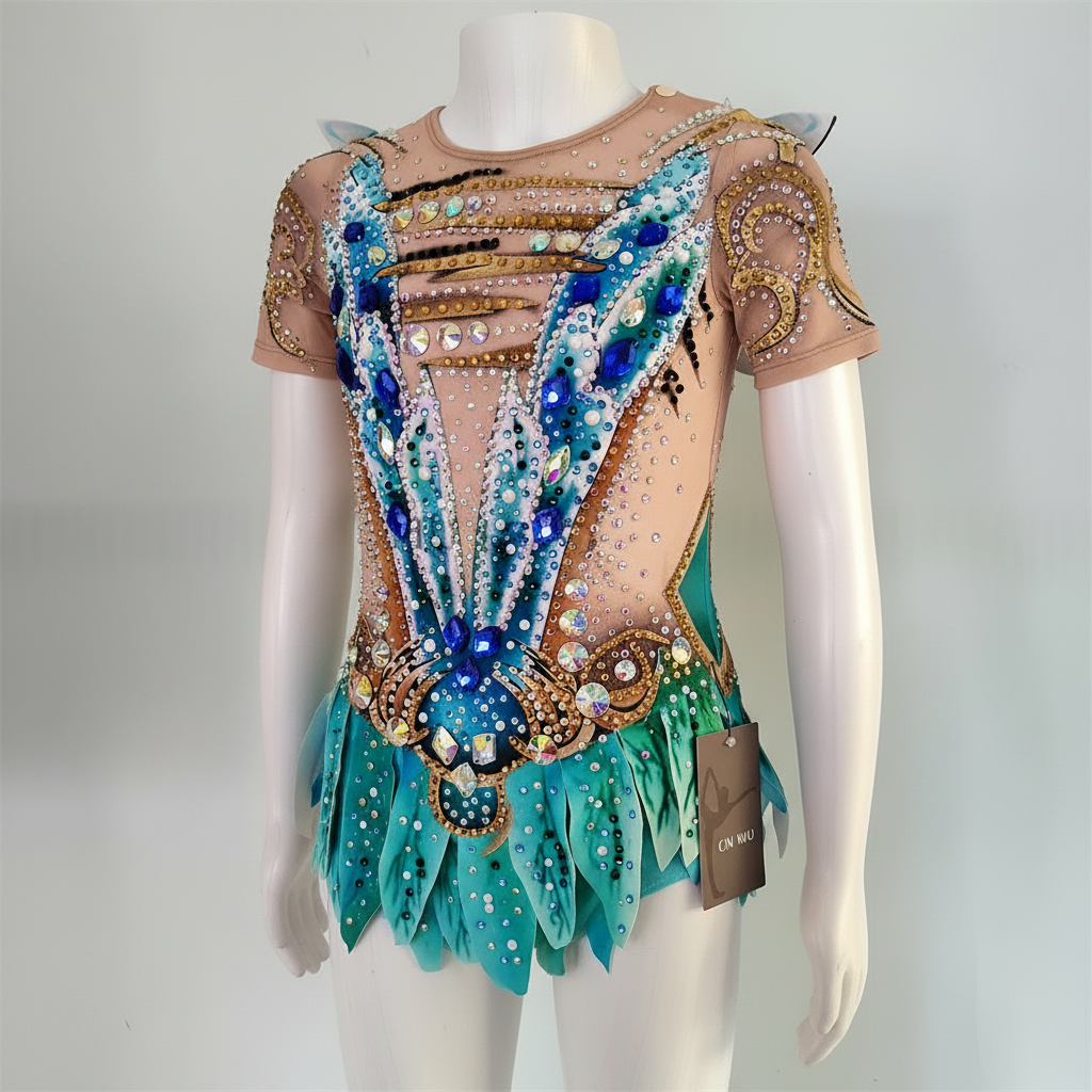 This rhythmic gymnastics leotard for girls features short sleeves and a striking blend of sequined mesh in blue and green, perfect for performances or practice sessions. Made with flexible materials, it provides a comfortable fit and ease of movement, while also being easy to care for.