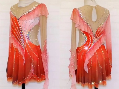 A striking ombre color palette transitions from vibrant orange to deep red, providing a visually captivating gradient. This bold color scheme, combined with the shimmering embellishments, ensures a memorable and impactful stage presence.