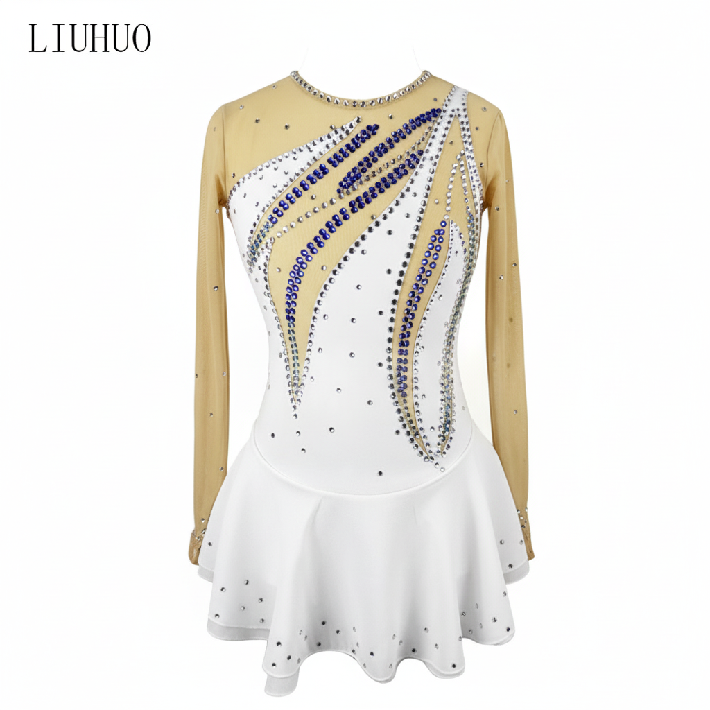 Experience the perfect blend of elegance and flexibility with this white and blue spandex leotard. Designed for rhythmic gymnastics, its long sleeves ensure full coverage while maintaining optimal stretch for graceful movements.