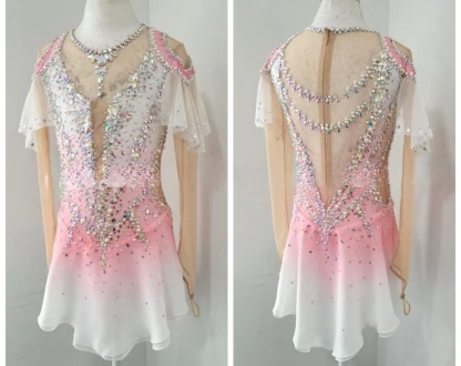 The stunning ombre color transition from white to vibrant pink on the skirt, complemented by the sparkling rhinestones, creates a captivating and dynamic aesthetic, ensuring you stand out on the ice.