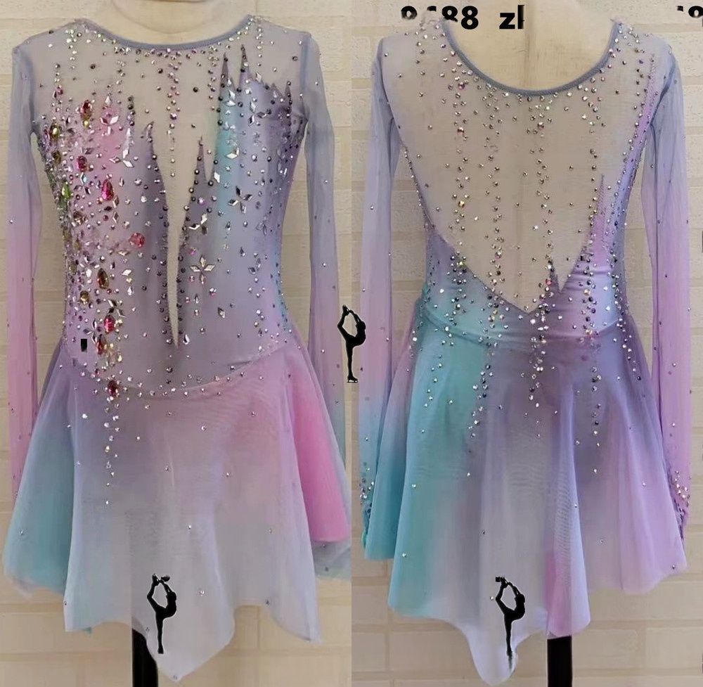 The open back design adds an element of allure and ensures breathability, while the intricate crystal embellishments catch the light, making this dress ideal for competitive figure skating, rhythmic gymnastics, or dance performances where visual impact is key.