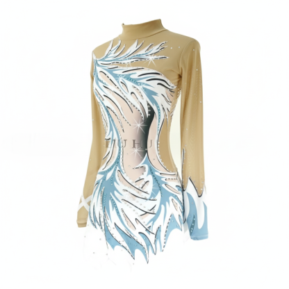 This sleeveless rhythmic gymnastics leotard features a white and blue stretch fabric that ensures freedom of movement during performances. Its design provides a snug fit, and its easy-care properties make it ideal for regular use by gymnasts.