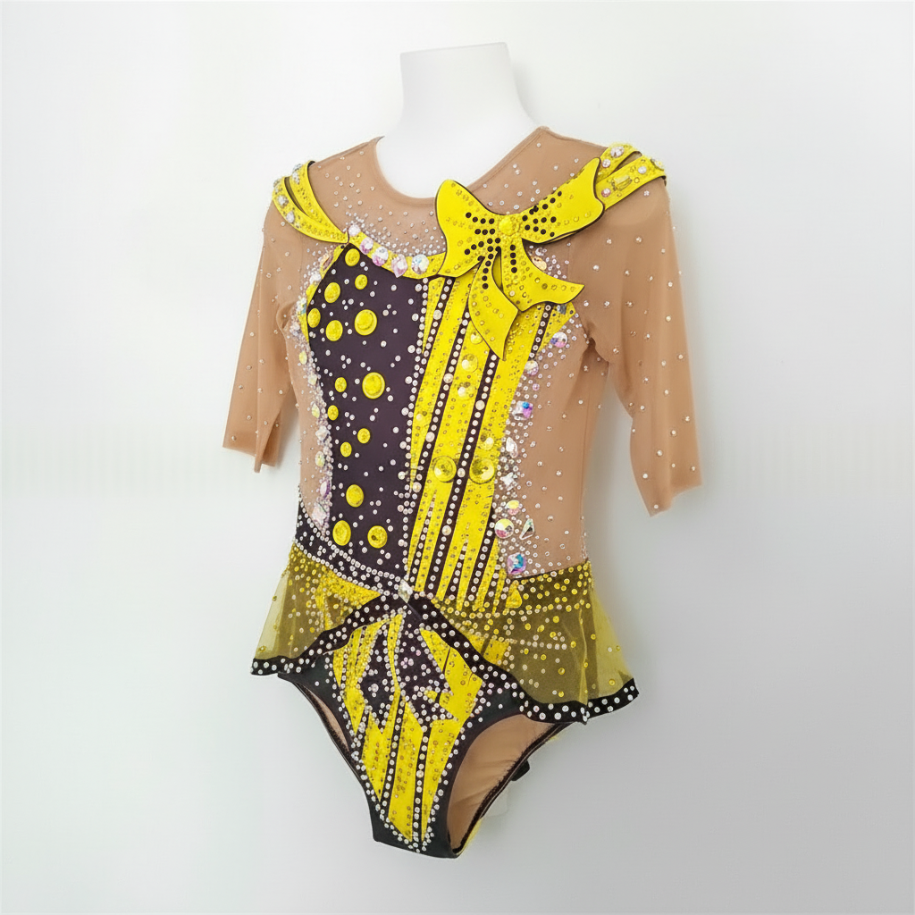 This vibrant yellow and black rhythmic gymnastics leotard, made from high-quality spandex, offers a flexible and comfortable fit for adult gymnasts. Perfect for performances or competitions, its easy-care fabric ensures it remains sleek and ready for use.
