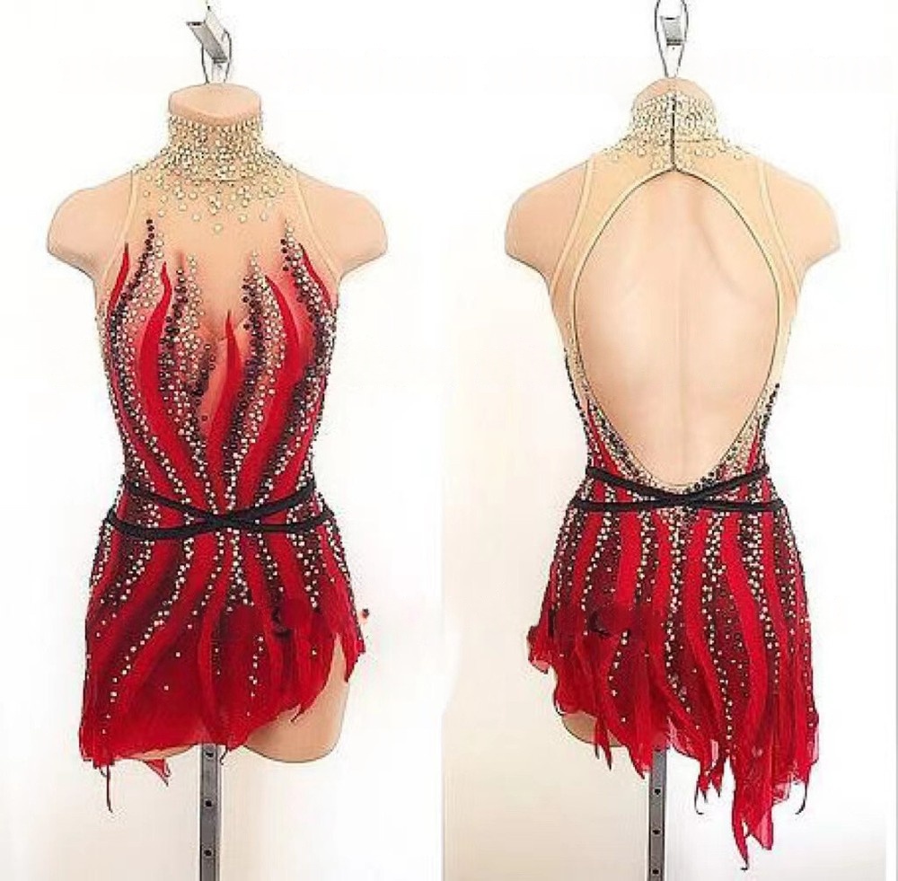 The dress showcases a vibrant red base with a flame-inspired pattern, richly embellished with countless rhinestones and sequins. These sparkling details create a dazzling effect under performance lighting.