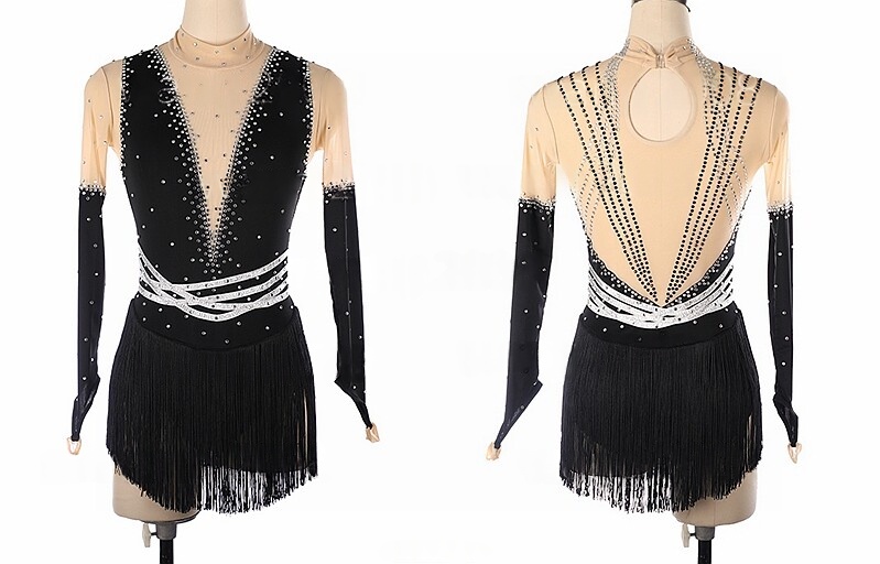 The dress features a compelling color block design in classic black and nude, enhanced by sparkling embellishments and a playful fringed skirt that adds dramatic flair to every spin and jump.