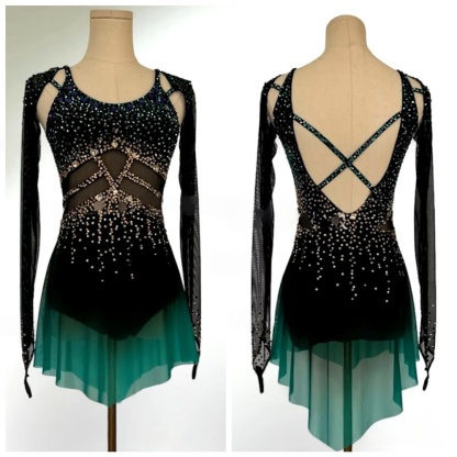 A captivating black to teal ombre color transition on the skirt, adorned with scattered rhinestones, creates a dynamic and visually stunning effect on the ice.