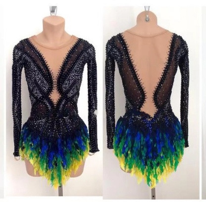 The design boasts a rich black base adorned with intricate rhinestone patterns, transitioning into a vibrant skirt of blue, green, and yellow feathers, creating a stunning visual gradient.