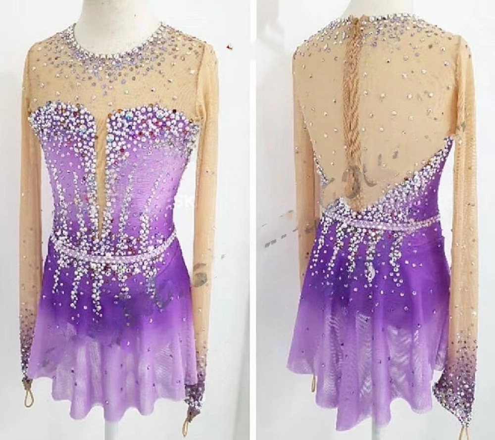Intricate embellishments define this garment, with a lavish application of rhinestones adorning the neckline, bodice, and skirt. The strategic placement of these crystals creates a dazzling sparkle under arena lights, enhancing visual appeal and adding a touch of glamour to every spin and jump.