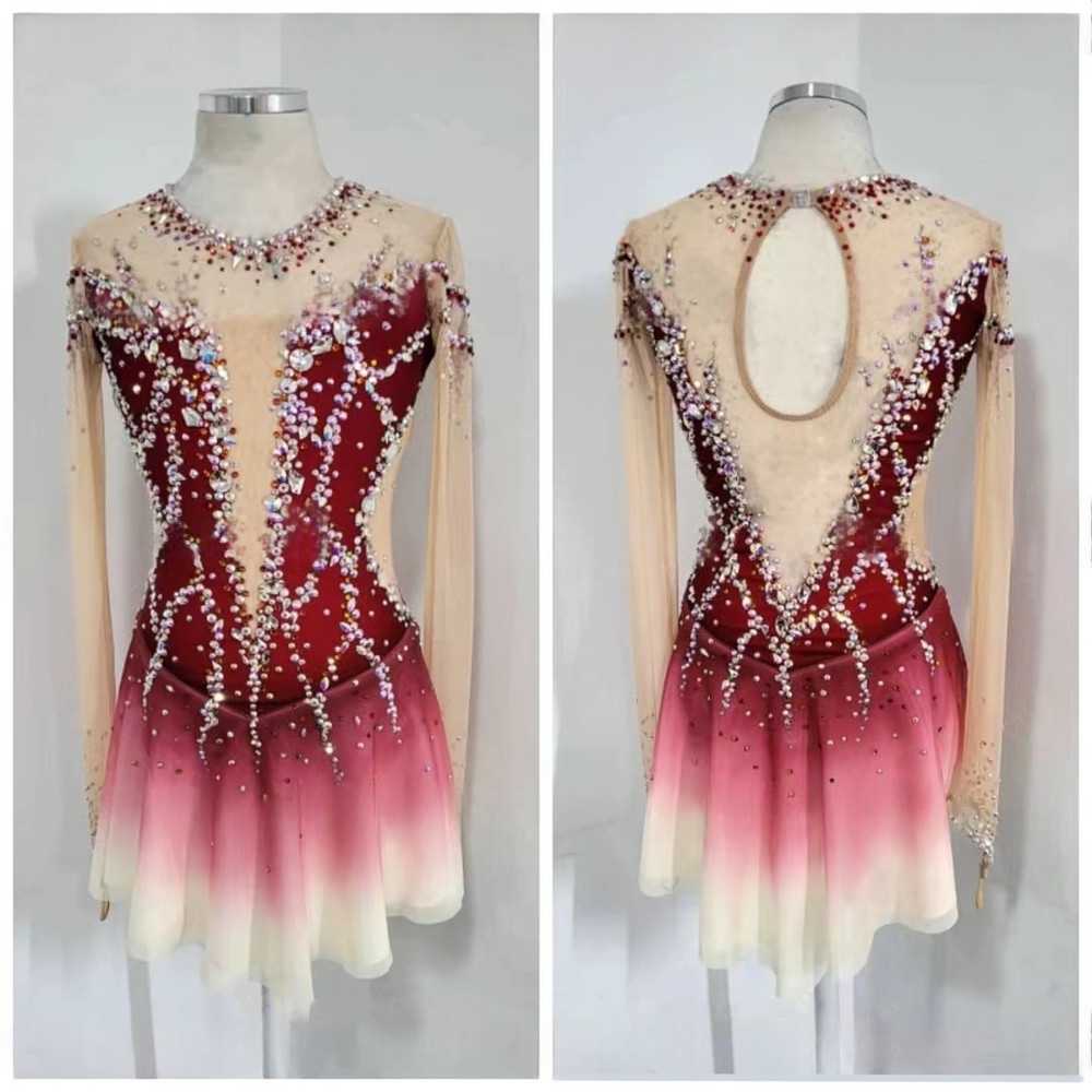 This figure skating dress features a fitted silhouette with a flared skirt, designed for graceful movement and an elegant presentation on the ice.