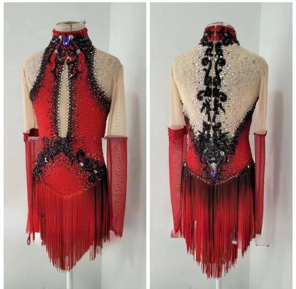The dominant red color is dramatically contrasted with black elements and sparkling embellishments, creating a vivid and dynamic aesthetic. The fringed skirt adds flair and movement to every turn and leap.