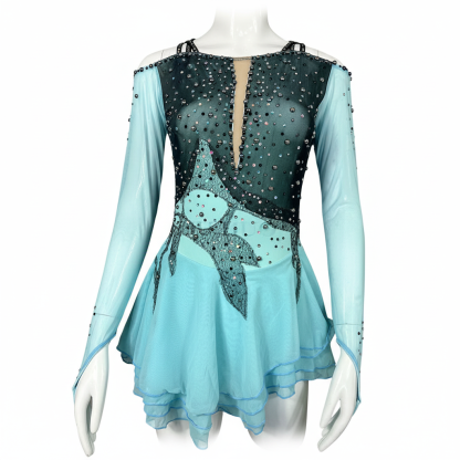 This aqua blue women's figure skating dress features embellished mesh and long sleeves for a stylish and functional design, perfect for performances. It offers stretchy comfort while allowing ease of movement on the ice, making it ideal for competitive and practice sessions.