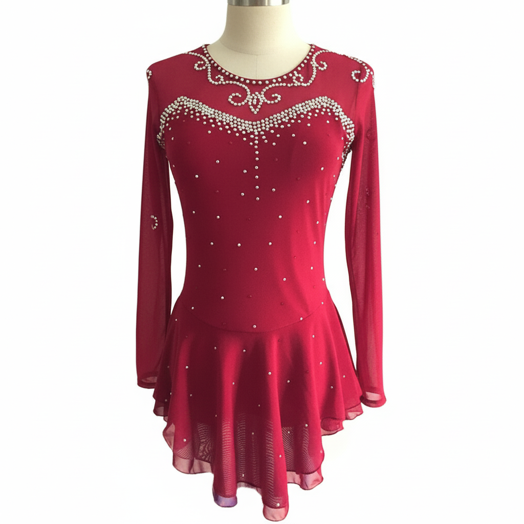 This women's figure skating dress features long sleeves and is beautifully adorned with rhinestones for an elegant look. The striking red fabric offers both style and comfort, perfect for dance performances and competitions.