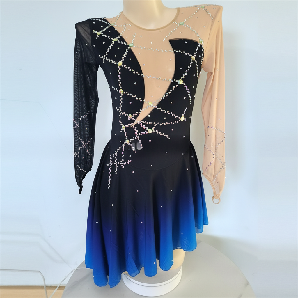 Delicately crafted with an elegant ombre black to blue fabric, this women's figure skating dress features long sleeves and is adorned with sparkling rhinestones, making it perfect for both practice sessions and competitive events. Its stretchable material ensures a snug fit while allowing full range of motion, and it's easy to maintain with spot cleaning or gentle machine wash.