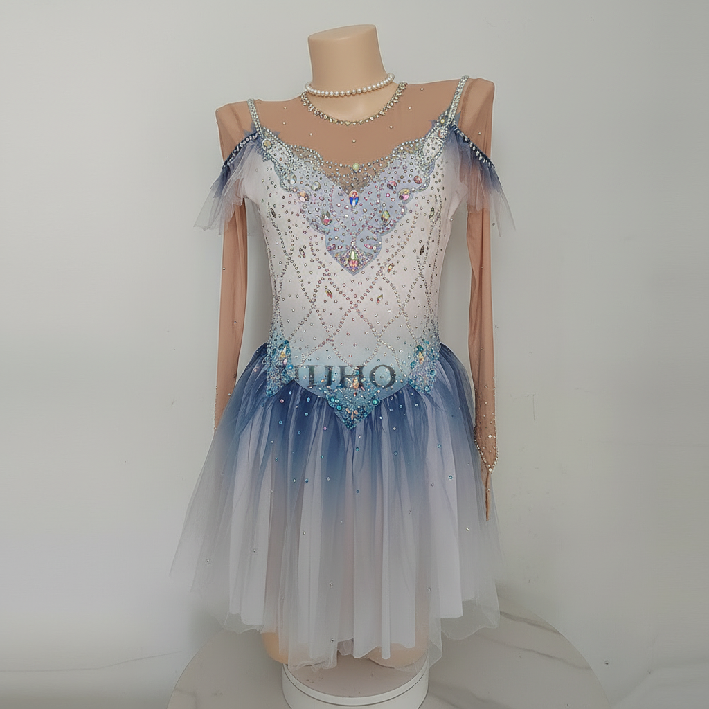 This exquisite women's figure skating dress features an ombre design in blue and white, elegantly adorned with rhinestones. It boasts a comfortable fit with long sleeves and offers excellent flexibility, perfect for showcasing your grace on the ice.