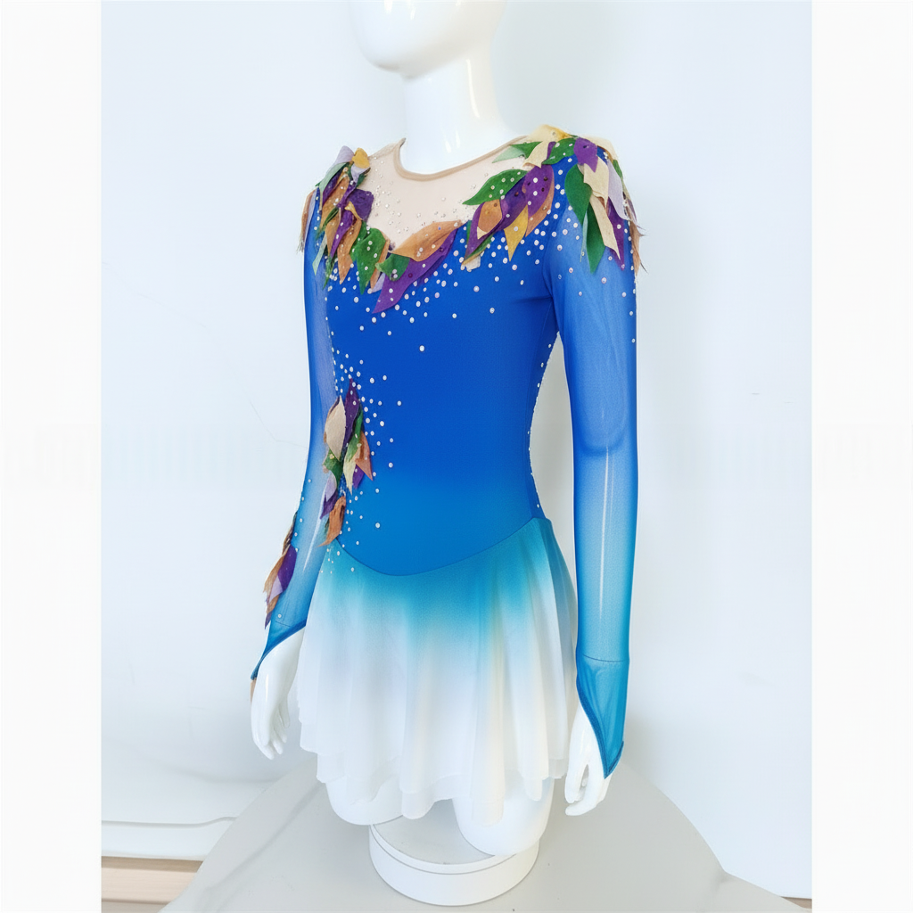 This elegant women's figure skating dress combines ombre mesh fabric in blue and white tones, providing both style and comfort with its long sleeves. Ideal for competitions or practice, the dress offers flexibility, while its easy-care fabric ensures longevity with minimal maintenance.