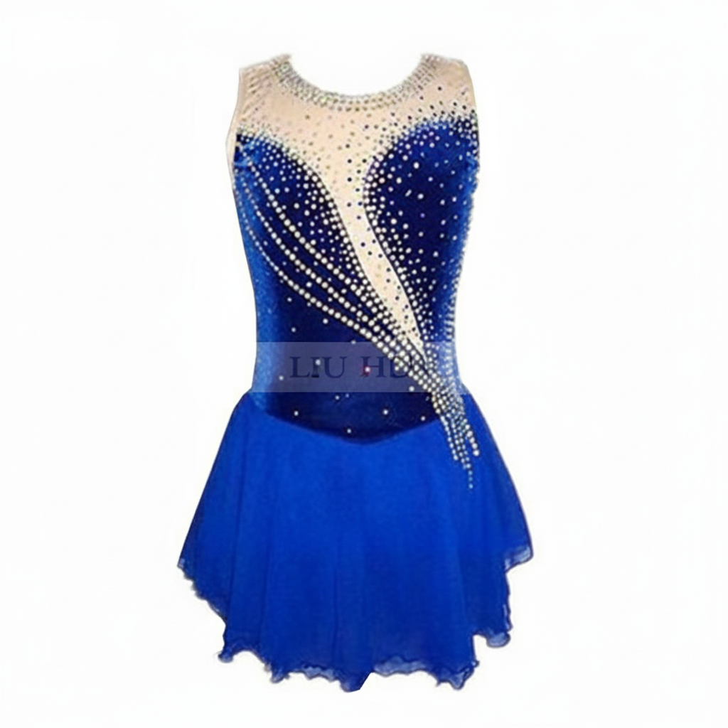 This women's figure skating dress in royal blue blends luxurious velvet and breathable mesh for a striking appearance on the ice. Its sleeveless design allows for ease of movement, making it perfect for competitive performance or practice, and the fabric offers both elasticity and easy care.