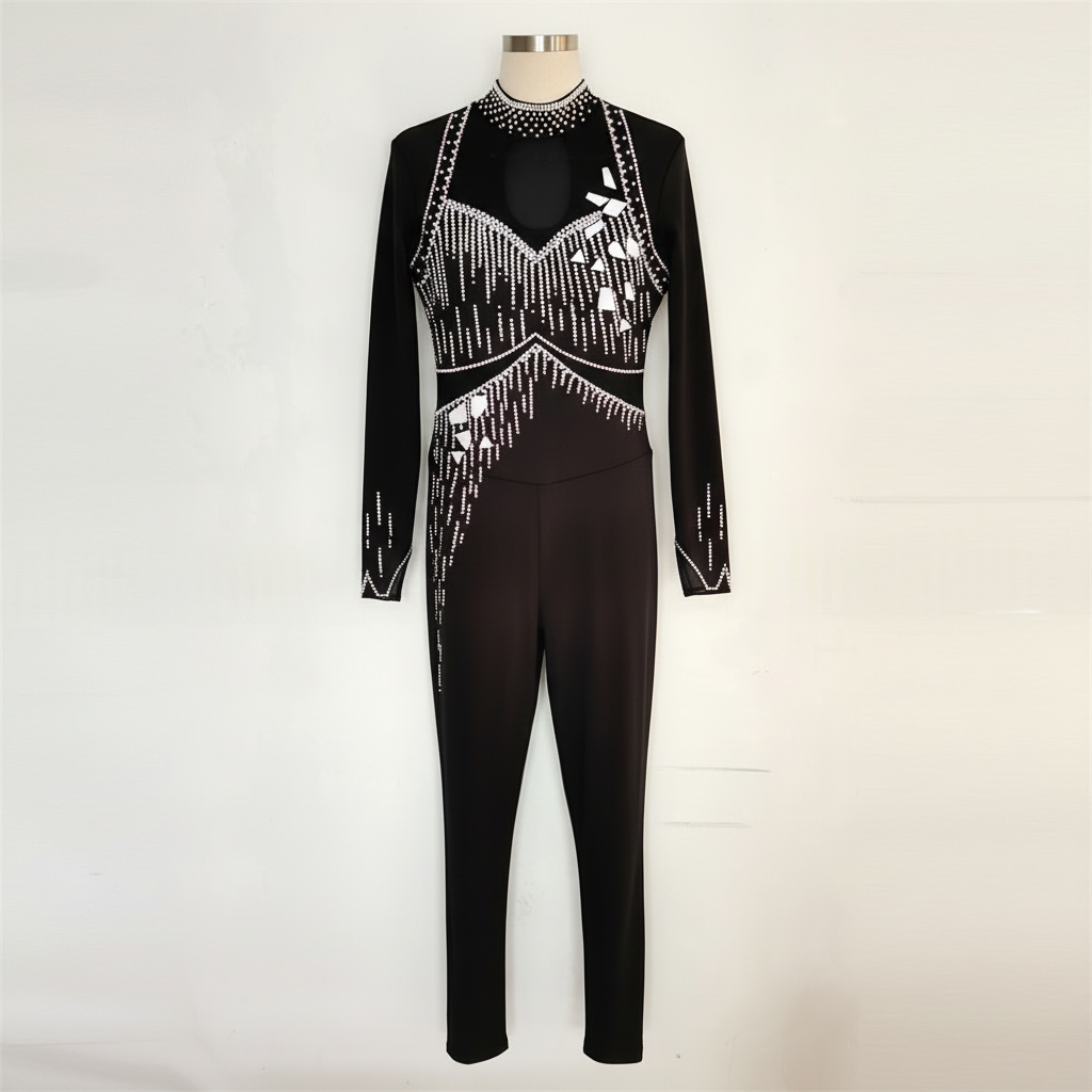 This Women's Rhinestone Fringe Jumpsuit dazzles with its sparkling embellishments and long sleeves, offering a chic and flexible fit ideal for performance dancewear. Crafted for comfort and style, it's perfect for stage performances, and its material requires gentle care to maintain its stunning look.
