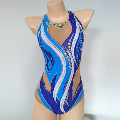 Experience elegance and performance with this sleeveless women's rhythmic gymnastics leotard, designed in stunning blue, white, and nude shades and embellished with rhinestones. Ideal for competitions and practice, its stretchy fabric ensures comfort and ease of movement, while requiring gentle care to maintain its intricate detailing.