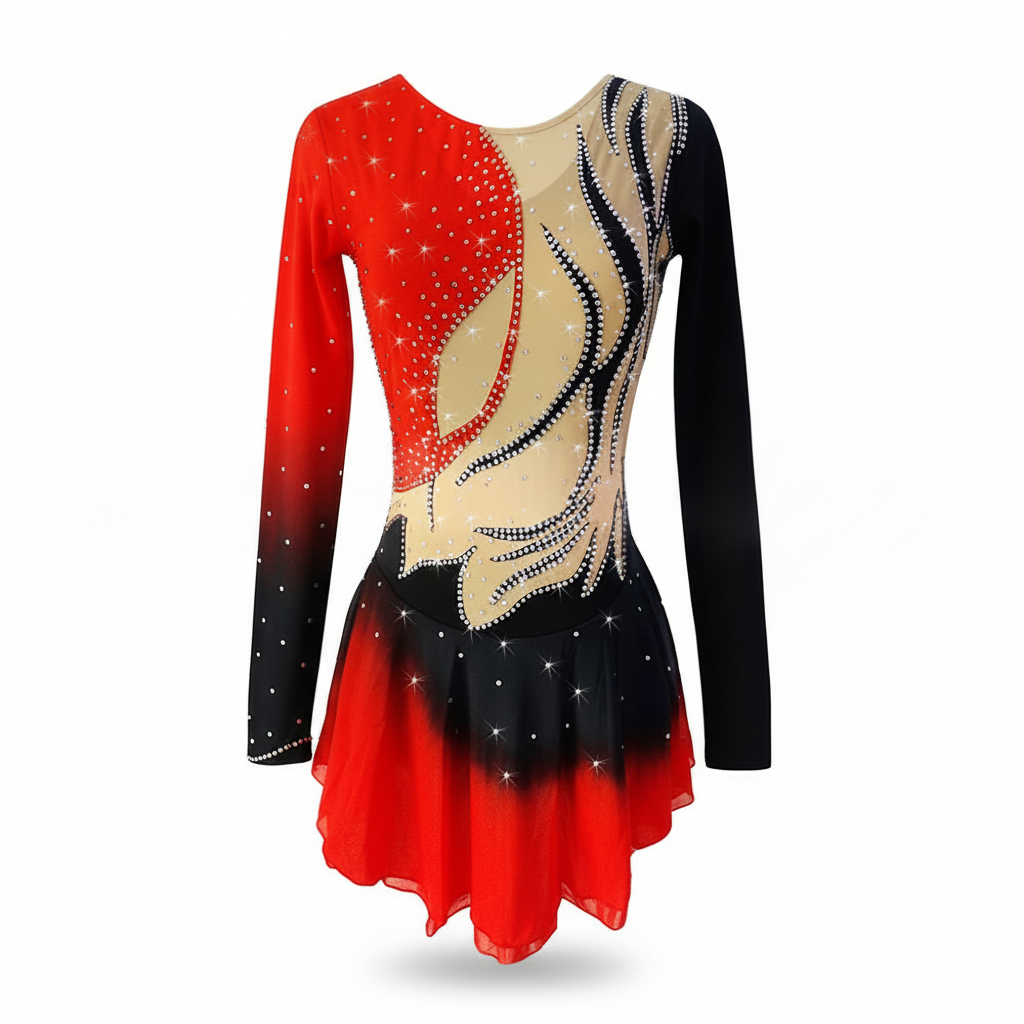 This elegant women's rhythmic gymnastics leotard features long sleeves and a striking red/black color scheme enhanced with rhinestone embellishments, providing both style and flexibility for performances. Crafted from a comfortable, stretchy material, it's perfect for competitions and training, ensuring ease of movement while maintaining beautiful form.