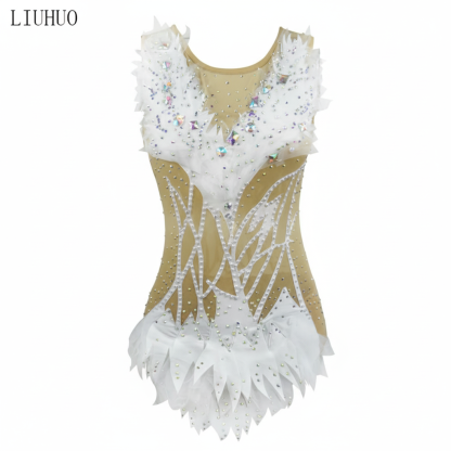 This sleeveless women's rhythmic gymnastics leotard features a sleek white design adorned with sparkling rhinestones for an elegant appearance. Made for flexibility and comfort, it is perfect for competitions or training sessions.
