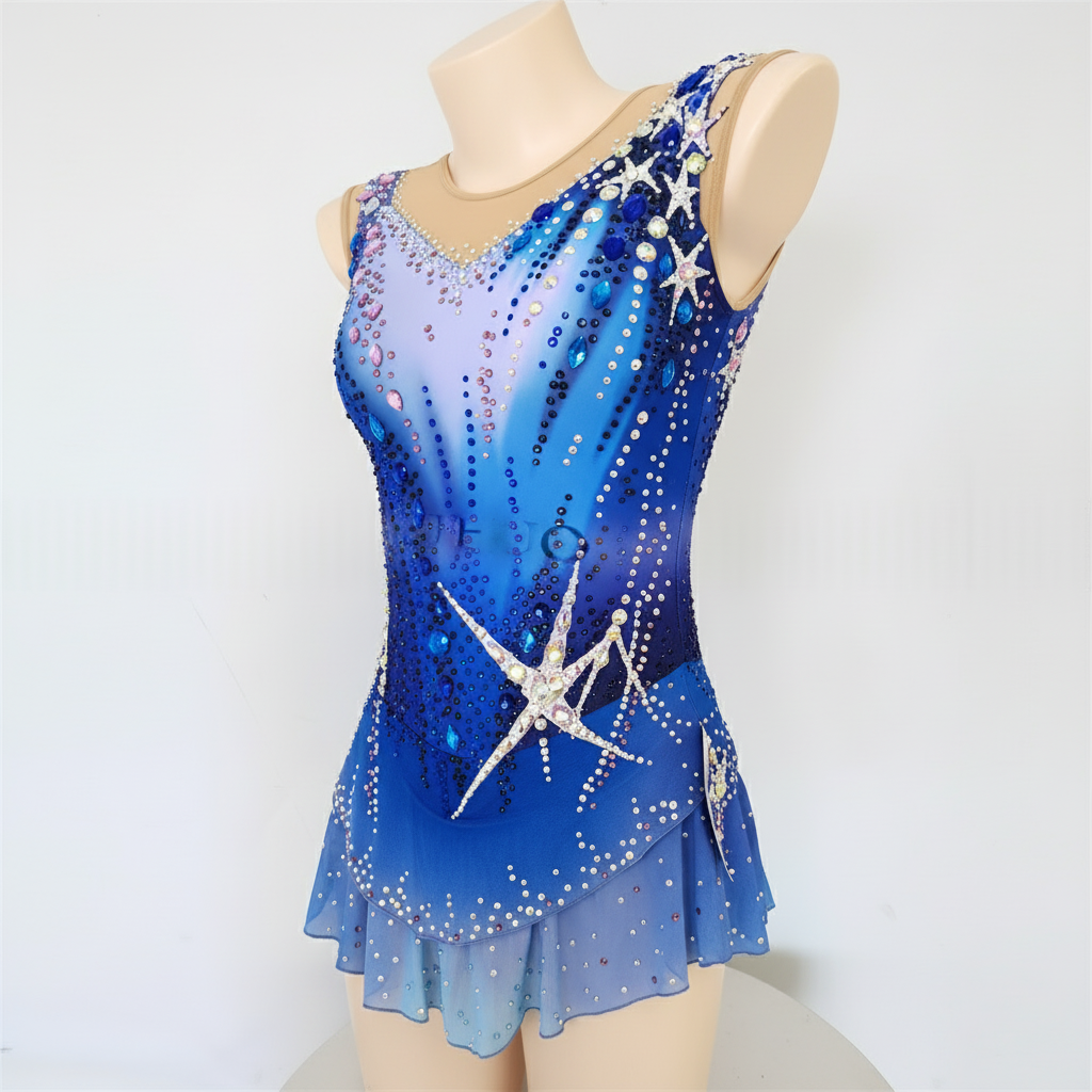 This leotard, crafted from high-quality Spandex, features a stunning blue ombre design perfect for rhythmic gymnastics. Its elastic nature ensures a comfortable fit for adults in size small, with easy care for regular use in practice sessions or performances.