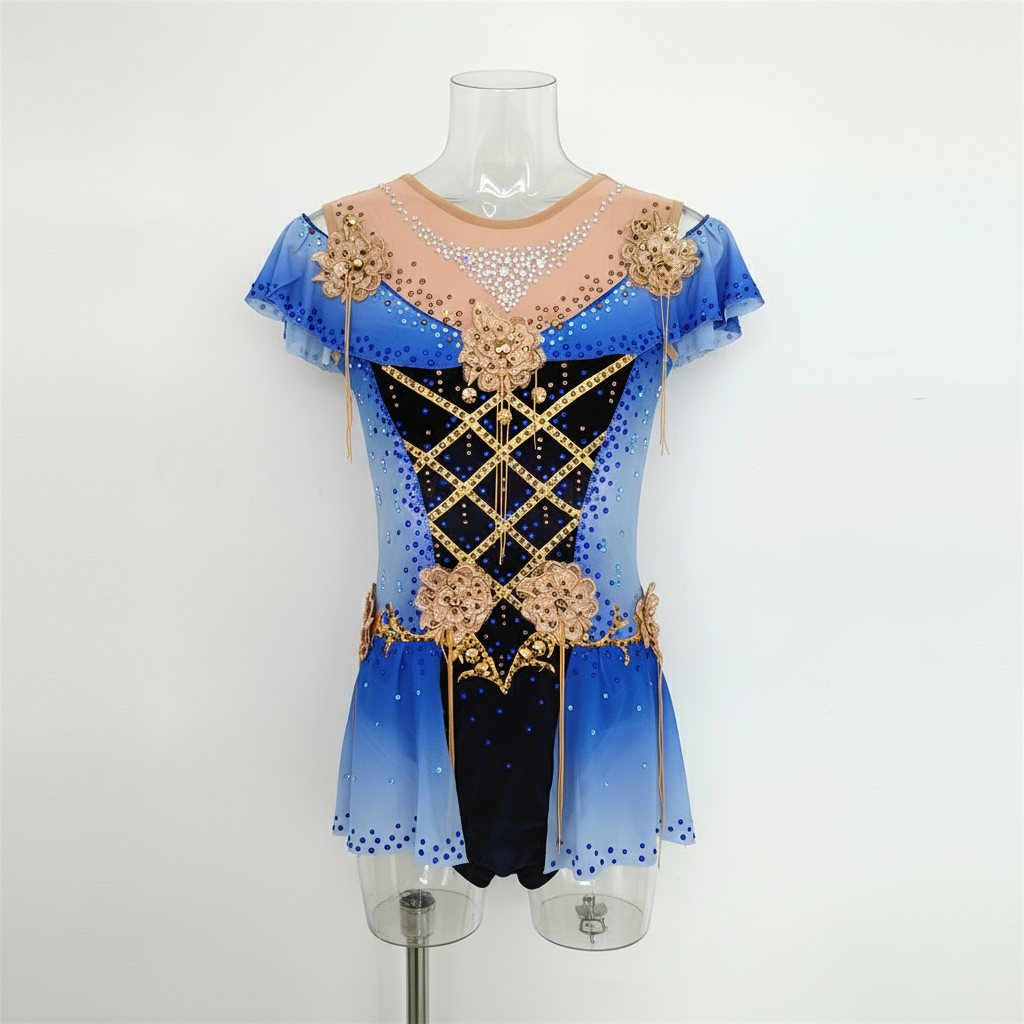 Crafted from stretchy spandex, this Women's Rhythmic Gymnastics Leotard features a striking blue ombre design for a captivating look. Ideal for performances and practice, it offers both comfort and ease of movement.