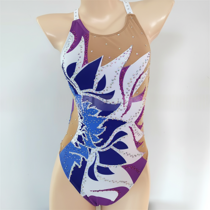 This women's rhythmic gymnastics leotard blends blue, purple, and white spandex for a comfortable fit that allows freedom of movement. Perfect for performances and practice, it offers excellent elasticity and easy care to keep you focused on your routine.
