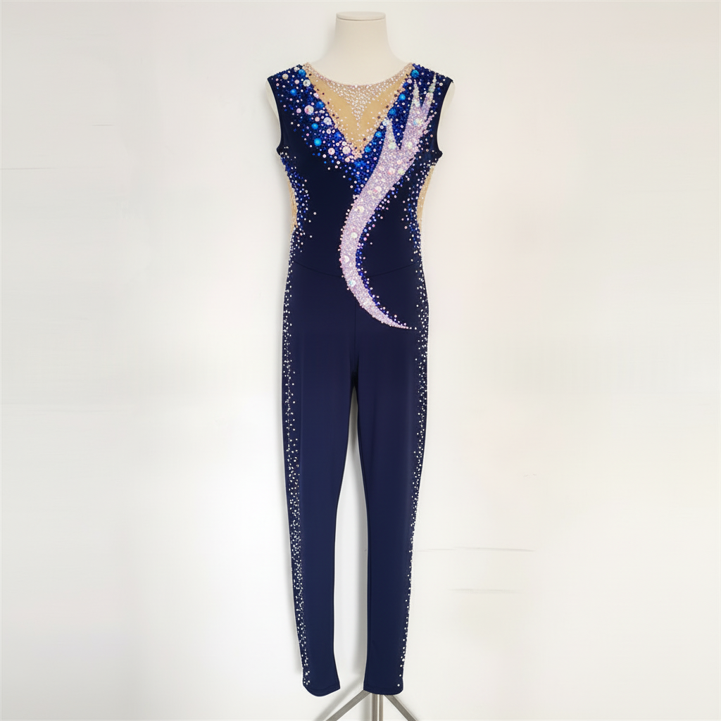This women's rhythmic gymnastics leotard is crafted from navy blue spandex, offering a sleek fit perfect for adult small sizes. With its excellent stretch and breathability, it's ideal for performances and practice sessions, ensuring comfort and ease of movement.