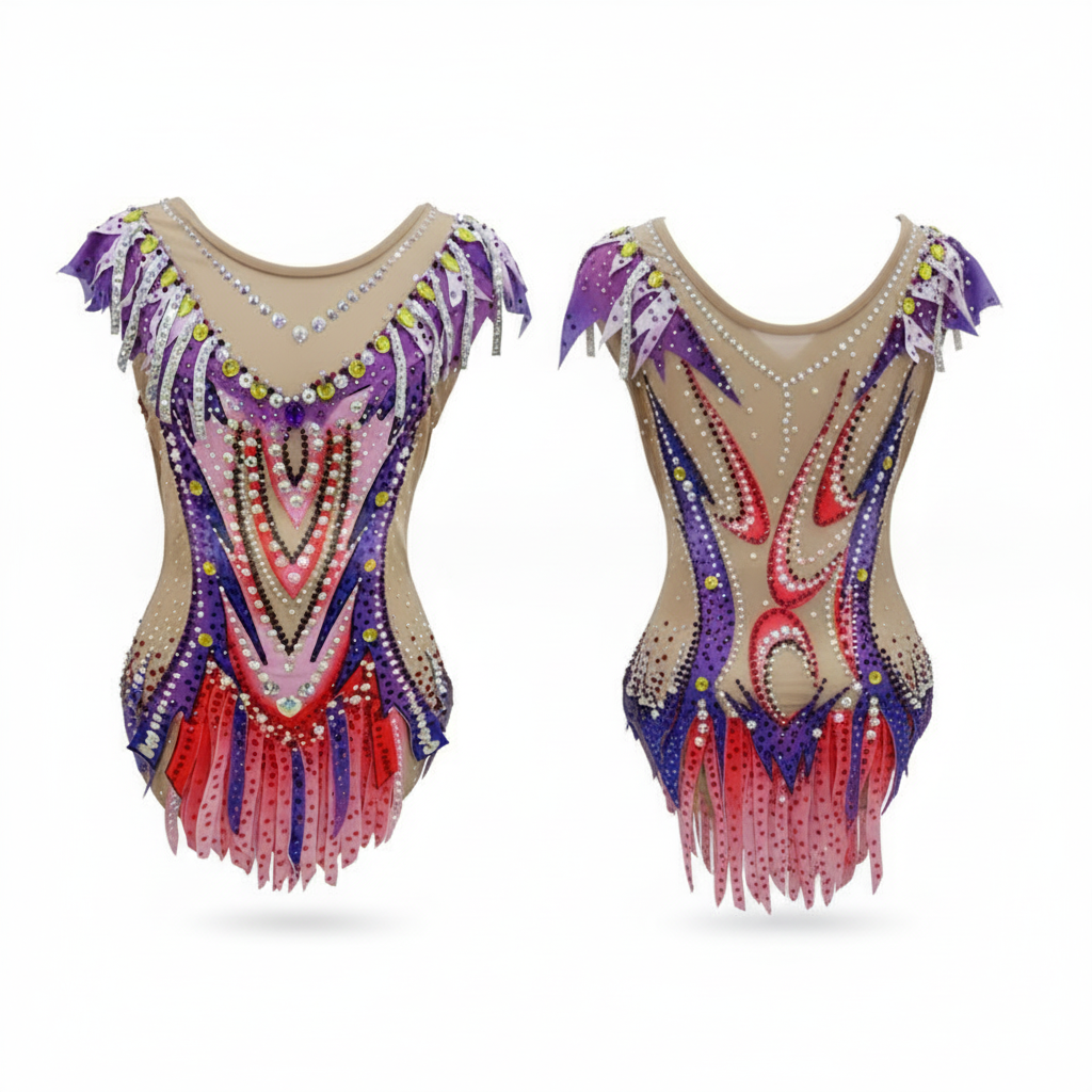 This adult Women's Rhythmic Gymnastics Leotard is crafted from a high-stretch spandex material, offering a snug and flexible fit ideal for competitions or practices. Available in purple, pink, and red, it combines vibrant aesthetics with functionality and easy care properties.