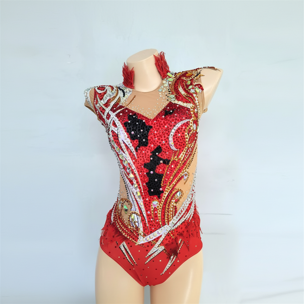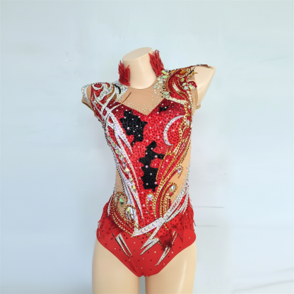 This women's rhythmic gymnastics leotard made from spandex offers a sleek red and black design, featuring a flexible fit ideal for performance routines. The material's excellent elasticity ensures unrestricted movement, while its easy-care properties make it a practical choice for gymnasts.