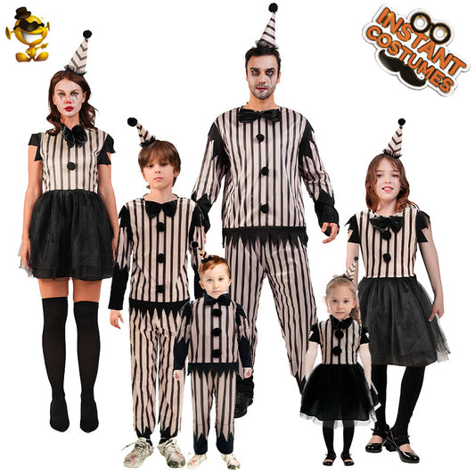 Costume de clown d'Halloween pour adultes et enfants, tenue de scène de cosplay rayée