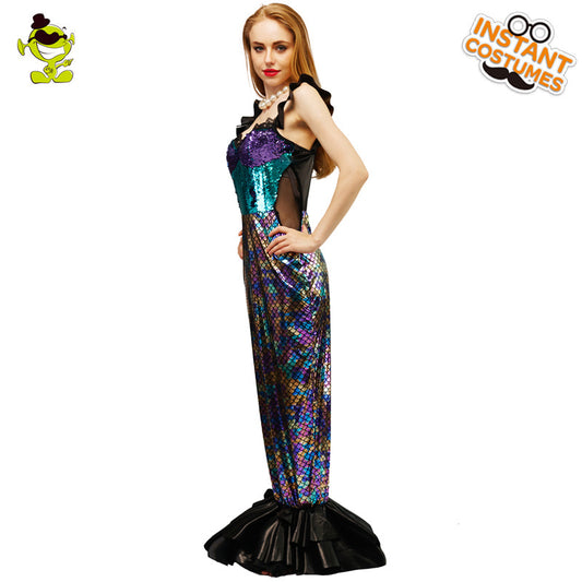 Costume de sirène d'Halloween pour femme, robe longue à paillettes, tenue de spectacle de fête