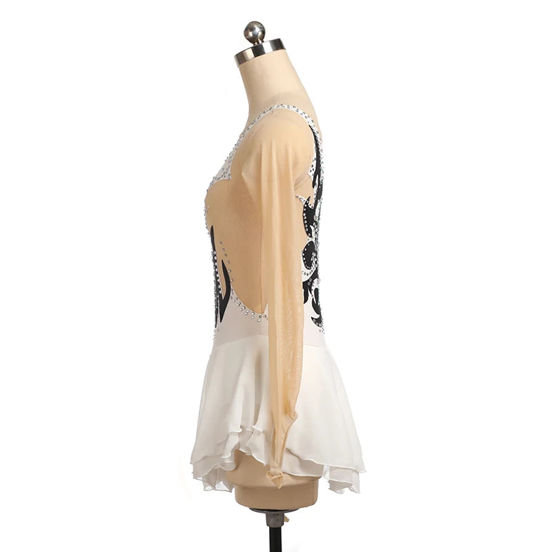 Designed for competition and training, this white-and-black Nasinaya dress uses a smooth stretch knit with breathable mesh accents, a contoured bodice for secure coverage, and a fluid skirt that moves elegantly on ice or in rhythmic routines. Customizable detailing and four-way elasticity support comfort and freedom of movement, while easy-care guidance—hand wash cold, line dry—helps maintain shape and performance through regular practice and stage use.